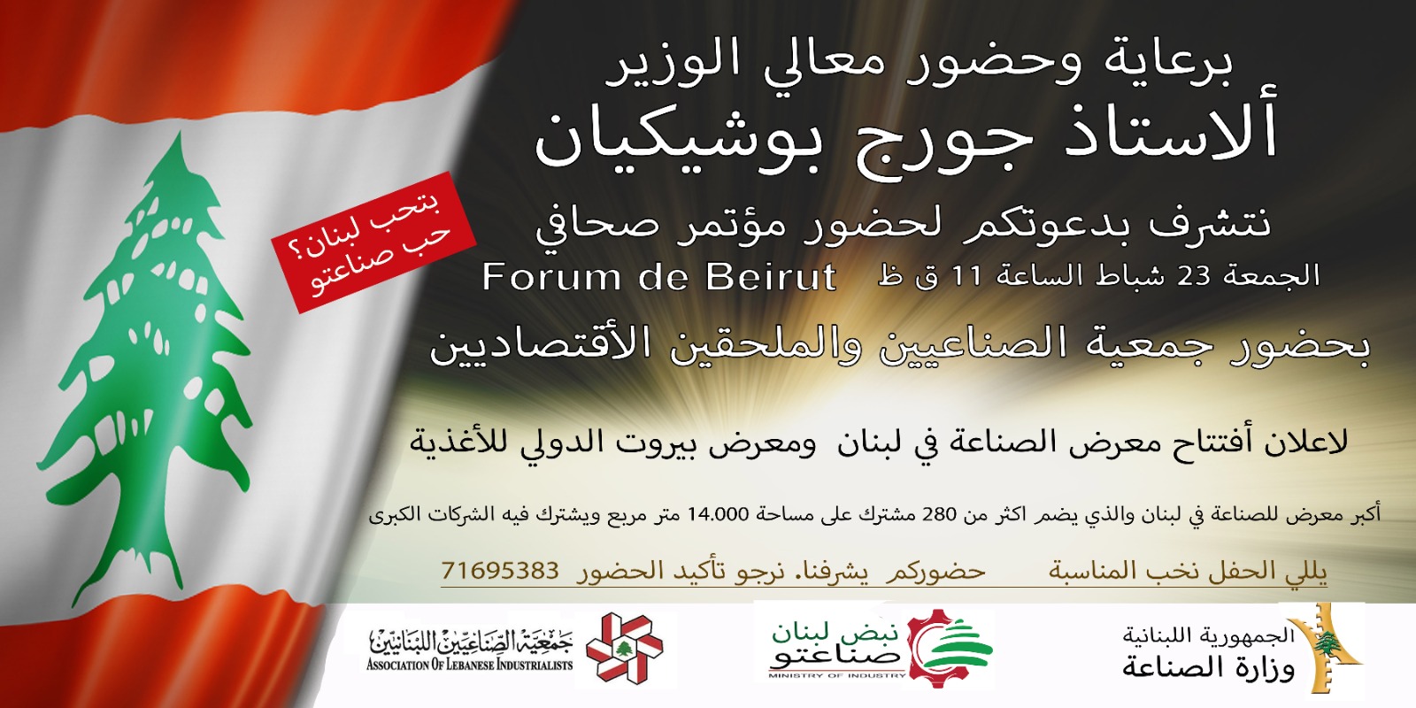 الحادية عشرة قبل ظهر الجمعة ٢٠٢٤/٢/٢٣ في فوروم دو بيروت، للإعلان عن اقامة معرض "صُنع في لبنان" في التاسع من أيار ٢٠٢٤ في فوروم دو بيروت. يشارك في المؤتمر رئيس جمعية الصناعيين اللبنانيين سليم الزعني، ورئيسا الشركتَين المنظمتَين ناصيف الخوري غانم Media Trade، وفادي